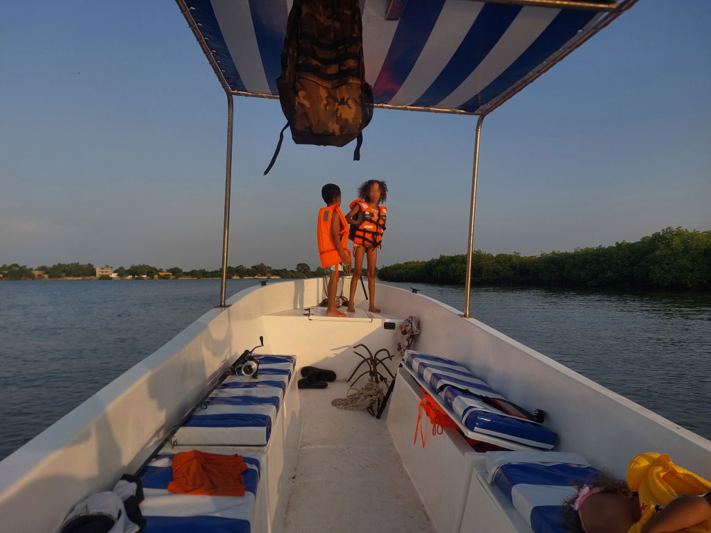 Sunset birdwatching trip—80€ for two adults, or 85 if you’re bringing up to two kids. From Ndangane we glide out around Marlodj Island, slip into the creeks and channels… watch the sky turn gold while pelicans, cormorans, egrets and herons fold up for the night. Then back before dark. Beautiful evening glide.
